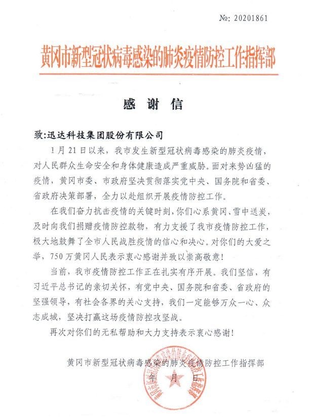 “在我們奮力抗擊疫情的關(guān)鍵時(shí)刻,你們心系黃岡、雪中送炭,及時(shí)向我們捐贈(zèng)疫情防控款物,有力支援了我市疫情防控工作,極大地鼓舞了全市人民戰(zhàn)勝疫情的信心和決心。對(duì)你們的大愛之舉,750萬黃岡人民表示衷心感謝并致以崇高敬意?!苯?,迅達(dá)科技集團(tuán)股份有限公司(以下簡(jiǎn)稱迅達(dá)廚電)收到了一封來自湖北省黃岡市新型冠狀病毒感染的肺炎疫情防控工作指揮部的感謝信,感謝迅達(dá)廚電在疫情期間,對(duì)該市及時(shí)捐贈(zèng)物資,助力抗“疫”的善舉。